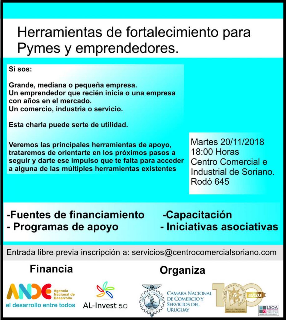 20 de Noviembre / 18Hs. El Martes 20 de Noviembre a las 18:00 horas en sala Juan Luis Cantoni del Centro Comercial e Industrial de Soriano (Rodó 645) se llevará a cabo en conjunto con la Cámara Nacional de Comercios y Servicios del Uruguay la charla sobre Herramientas para el Fortalecimiento de Pymes y Emprendedores. […]