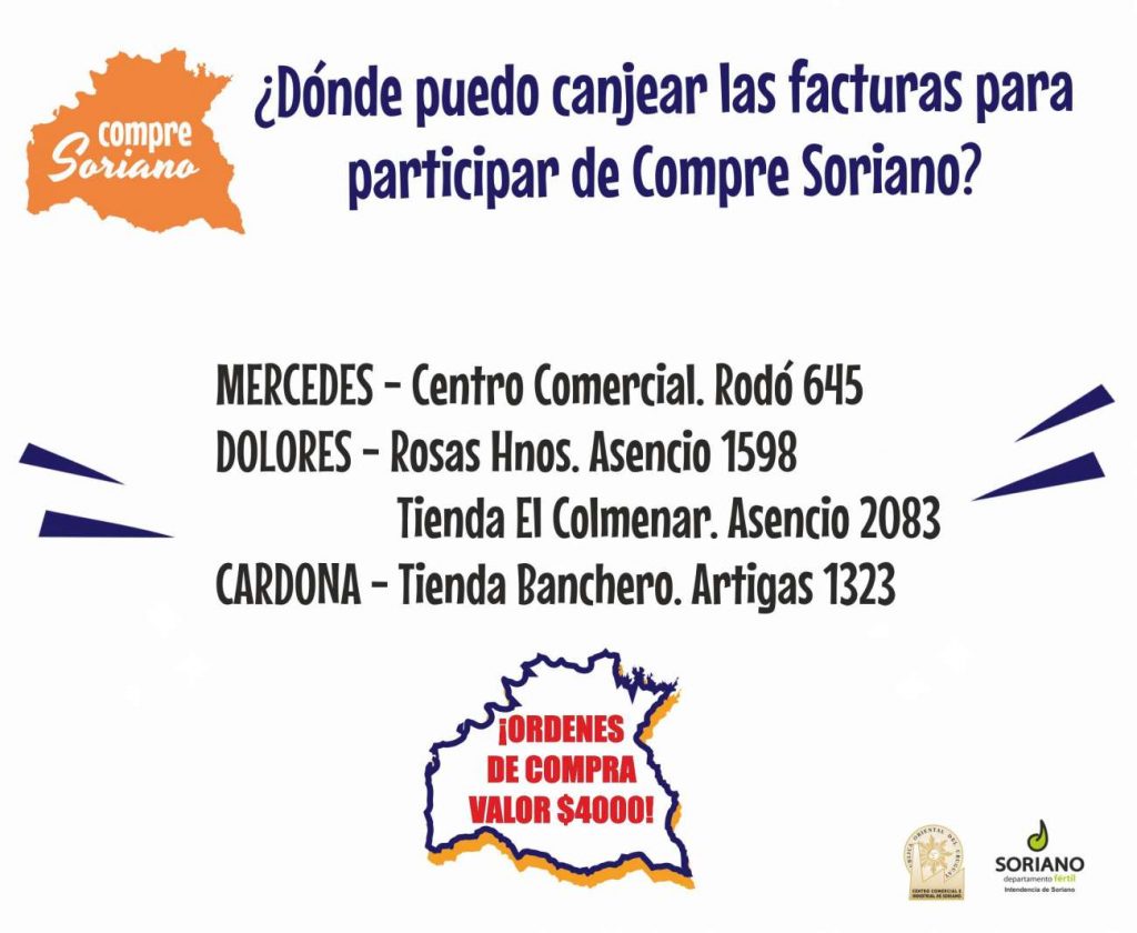 Ordenes de compra todos los meses Para participar de Compre Soriano pueden canjear 10 facturas de distintos comercios, correspondiente al mes en curso por un cupón en los siguientes lugares: MERCEDES – Centro Comercial. Rodó 645 DOLORES – Rosas Hnos. Asencio 1598 Tienda El Colmenar. Asencio […]