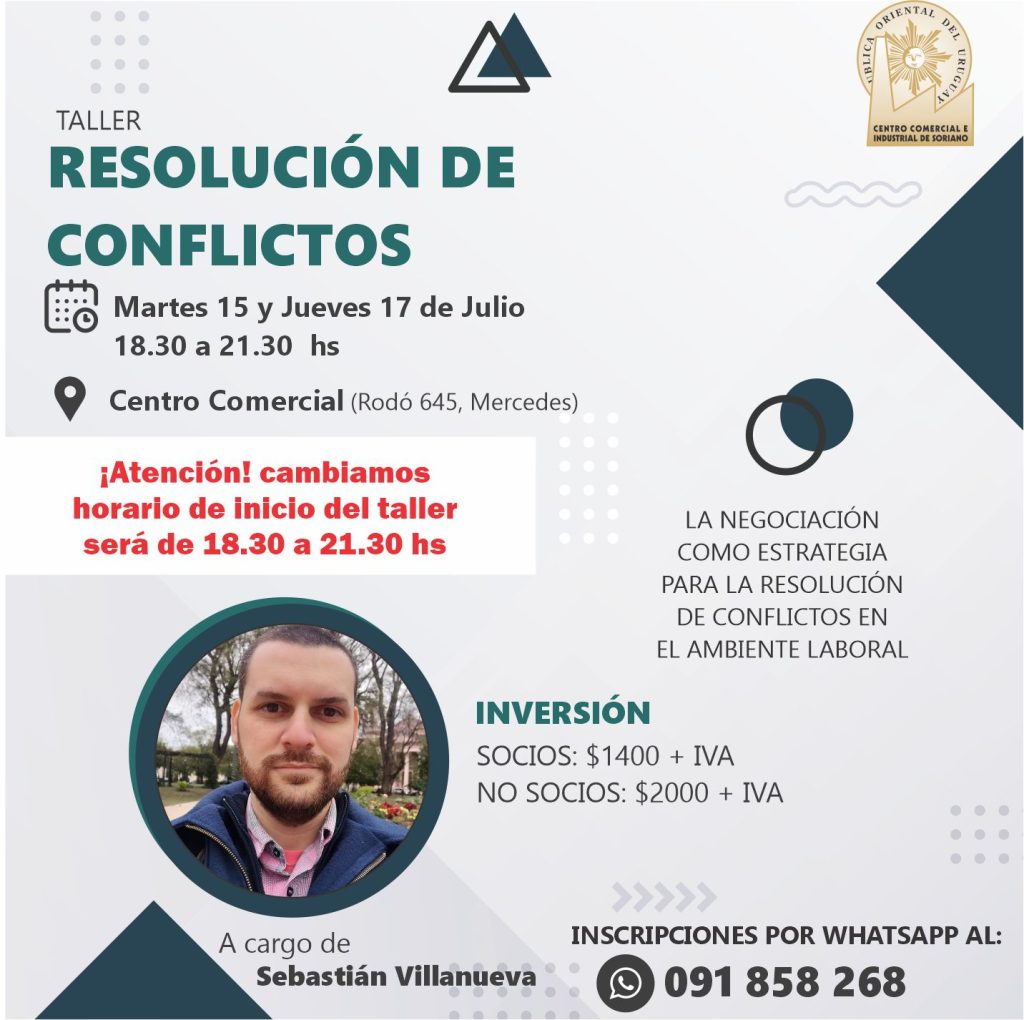 LA NEGOCIACIÓN COMO ESTRATEGIA PARA LA RESOLUCIÓN DE CONFLICTOS EN EL AMBIENTE LABORAL Disertante: Sebastián Darío Villanueva Fecha: Martes 15 y Jueves 17 de Julio Hora: 18.30 a 21.30 horas Lugar: Centro Comercial (Rodó 645, Mercedes) Inversión: SOCIOS: $1400 + IVA NO SOCIOS: $2000 + IVA Inscripciones al 45322193 / 091858268 O completando el formulario […]