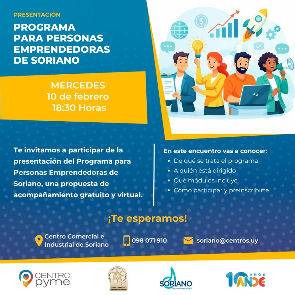 Te invitamos a participar de una charla informativa donde vas a conocer en detalle esta propuesta de acompañamiento gratuito y virtual, pensada para personas emprendedoras del departamento. 📍 Lugar: Centro Comercial e Industrial de Soriano 📅 Fecha: 10 de febrero ⏰ Hora: 18:30 h 📞 Consultas: 098 071 910 Emprender no tiene que ser en […]