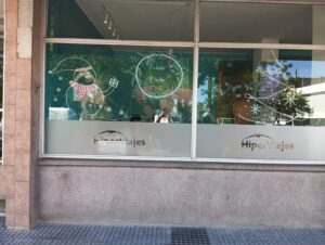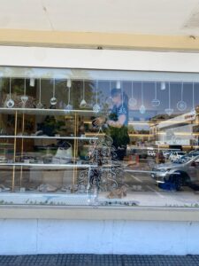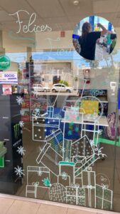 Valeria Constantin está realizando intervenciones en las vidrieras de los comercios de Mercedes.