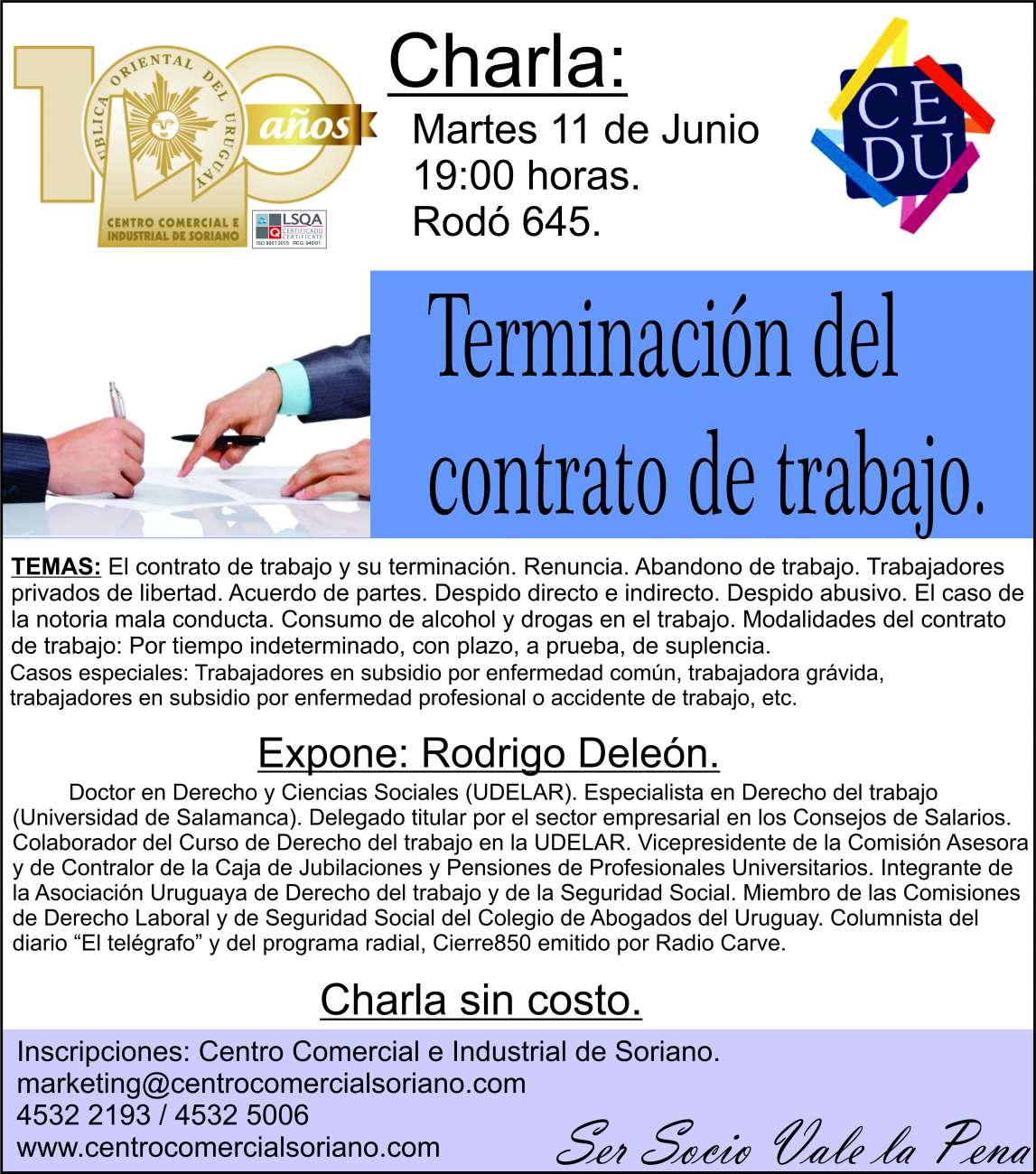 Dictada por Rodrigo Deleón. El próximo martes 11 de Junio se realizará la charla sobre Terminación del contrato de trabajo, a cargo