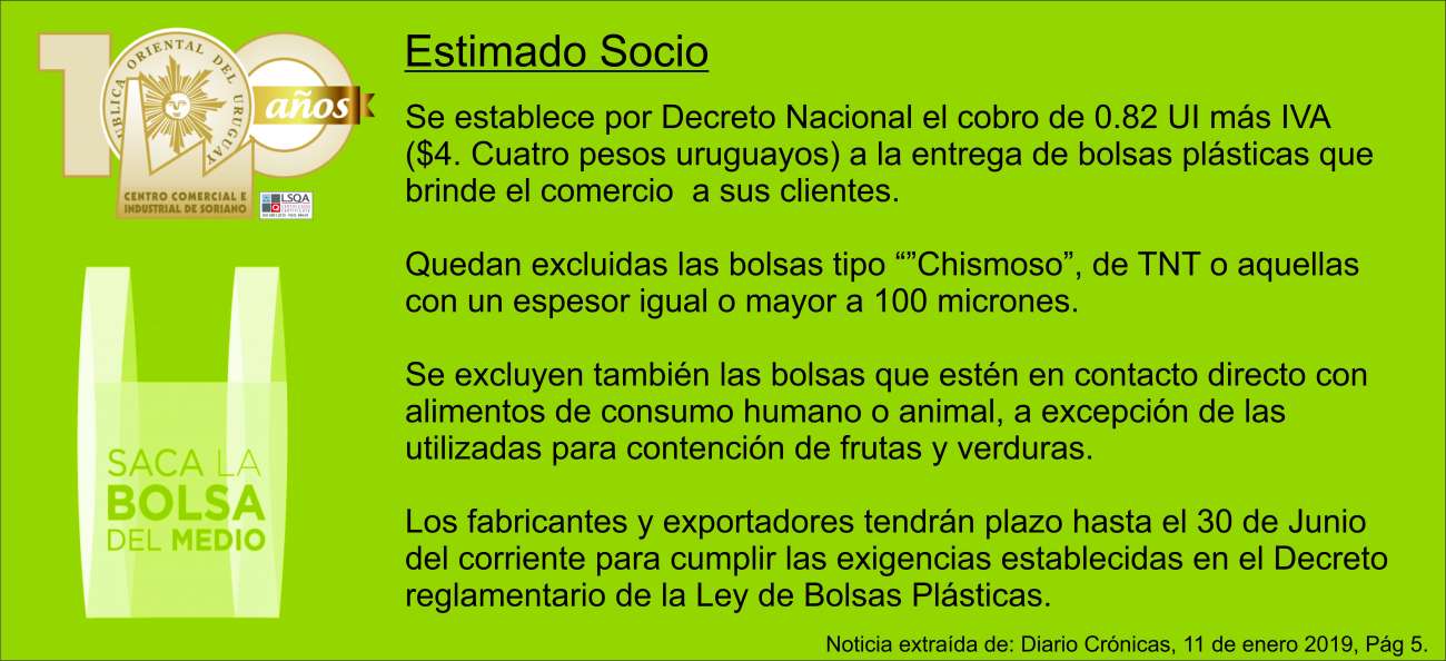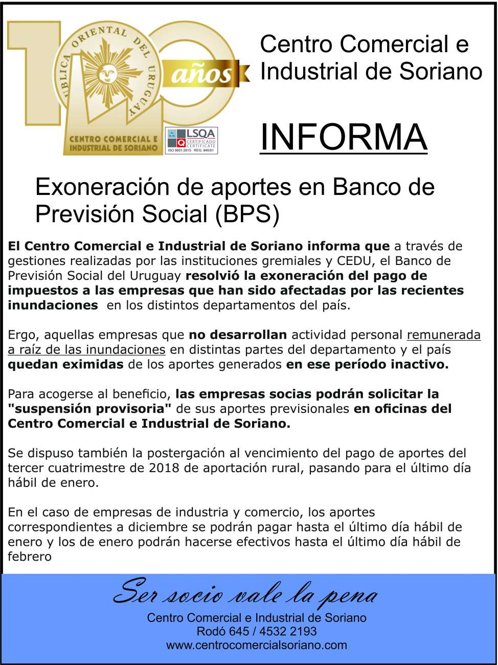 Beneficio a los damnificados por inundaciones. El Centro Comercial e Industrial de Soriano informa que a través de gestiones realizadas por las