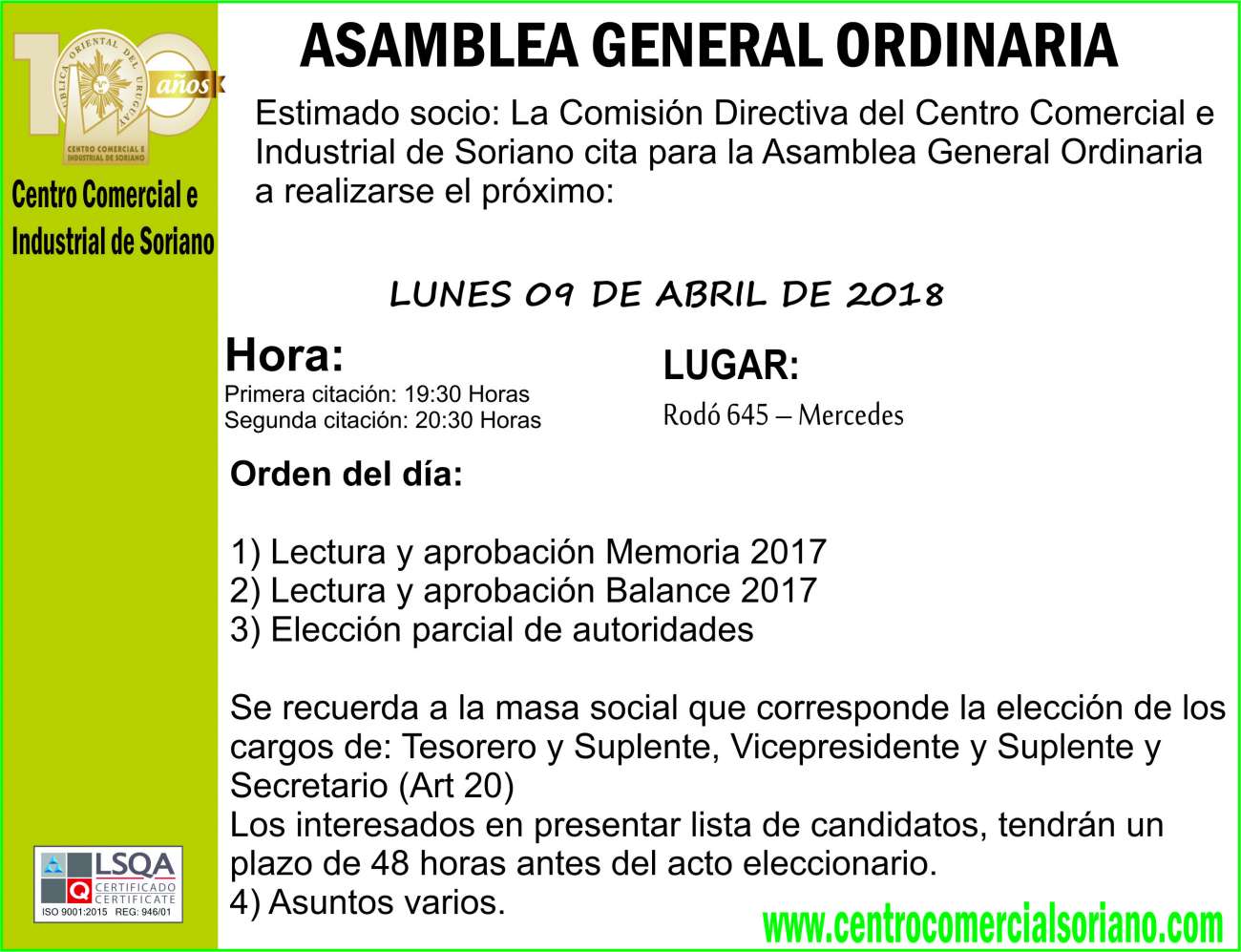 Lunes 9 de Abril de 2018 El próximo lunes 9 del corriente se desarrollará en sala del Centro Comercial e Industrial de