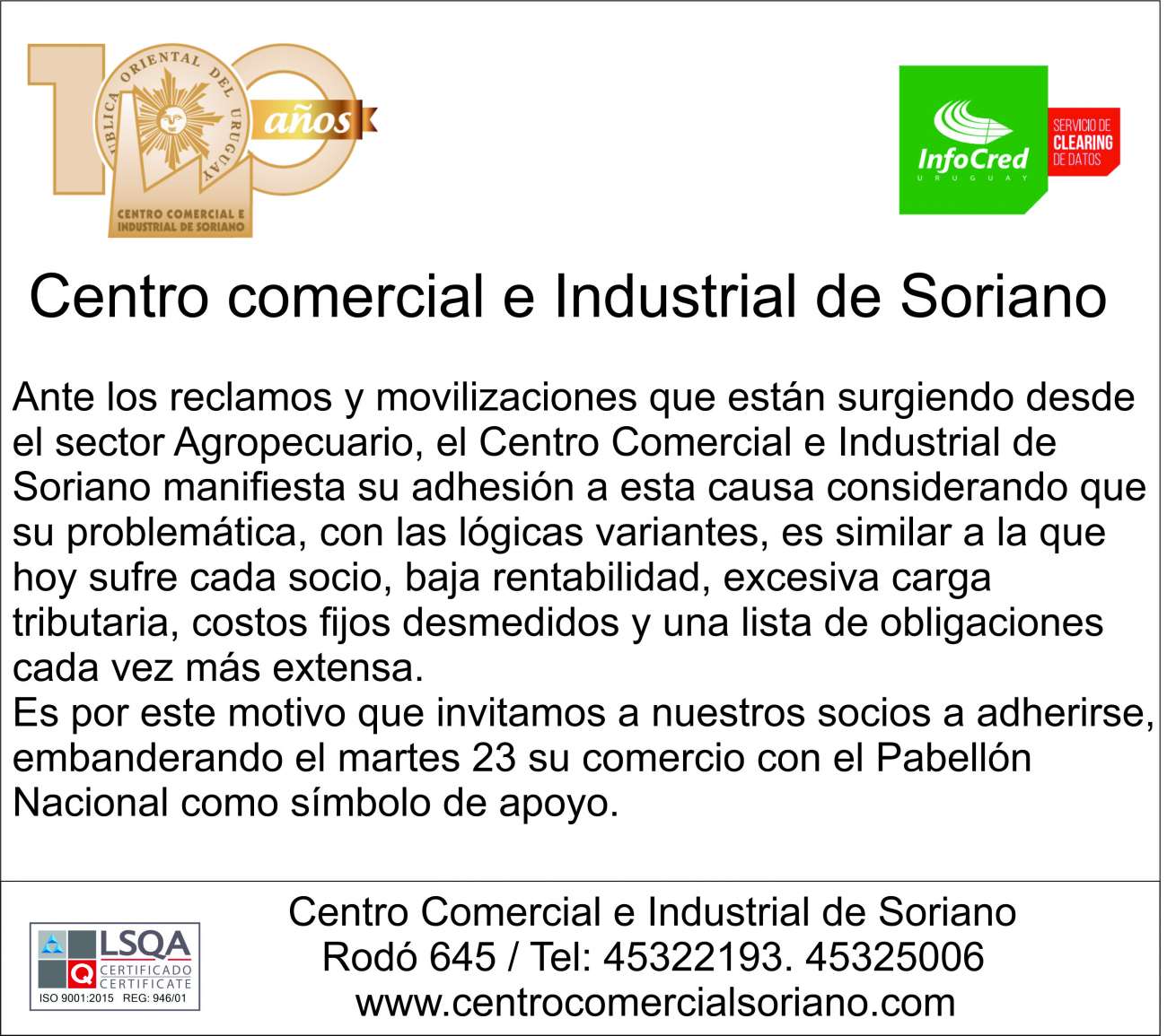 El centro comercial invita. Ante los reclamos y movilizaciones que surgen desde el sector Agropecuario, el Centro Comercial e Industrial de Soriano