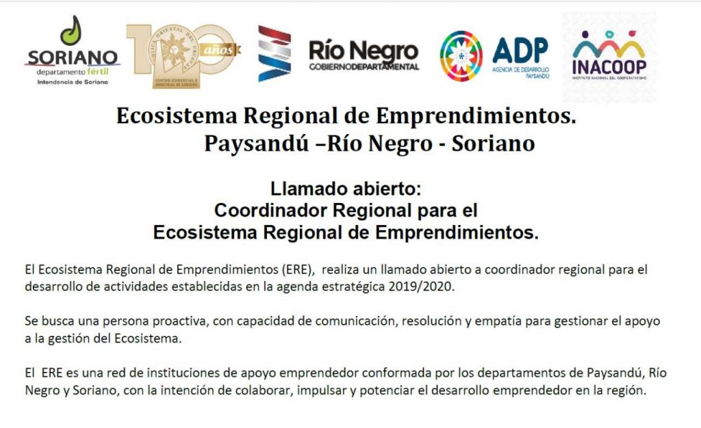 El Ecosistema Regional de Emprendimientos que llevan adelante diversas instituciones de los departamentos de Soriano, Paysandu y Río Negro, seleccionan Coordinador para llevar adelante la agenda estrategica 2019/2020.