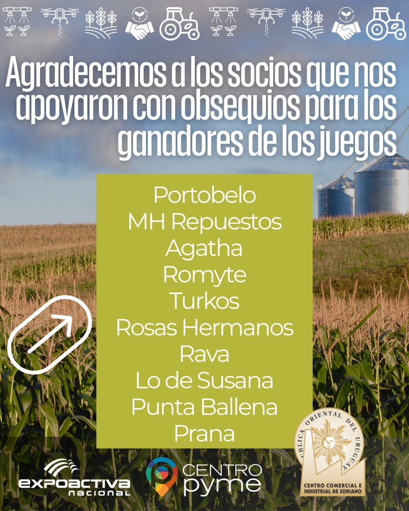 Agradecemos a nuestros socios Portobelo, MH Repuestos, Agatha, Romyte, Turkos, Rosas Hermanos, Rava, Lo de Susana, Punta Ballena y Prana por su apoyo con obsequios para brindar en los distintos juegos que realizamos durante la Expoactiva Nacional 2026.